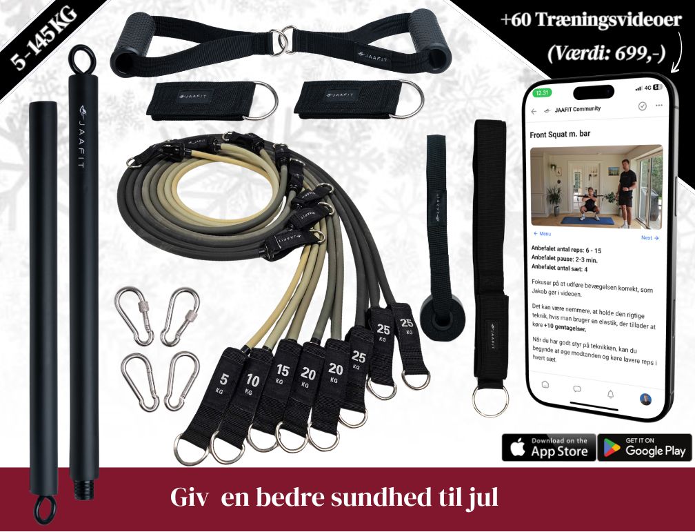 Der er ingen grænse for, hvilke øvelser du kan udføre med JAA FIT PRO. Med vores bar, elastikker, ankelstropper og håndtag, kan du træne hele kroppen lige så effektivt som i fitnesscentret.