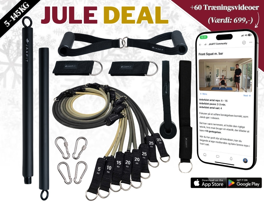 Der er ingen grænse for, hvilke øvelser du kan udføre med JAA FIT PRO. Med vores bar, elastikker, ankelstropper og håndtag, kan du træne hele kroppen lige så effektivt som i fitnesscentret.